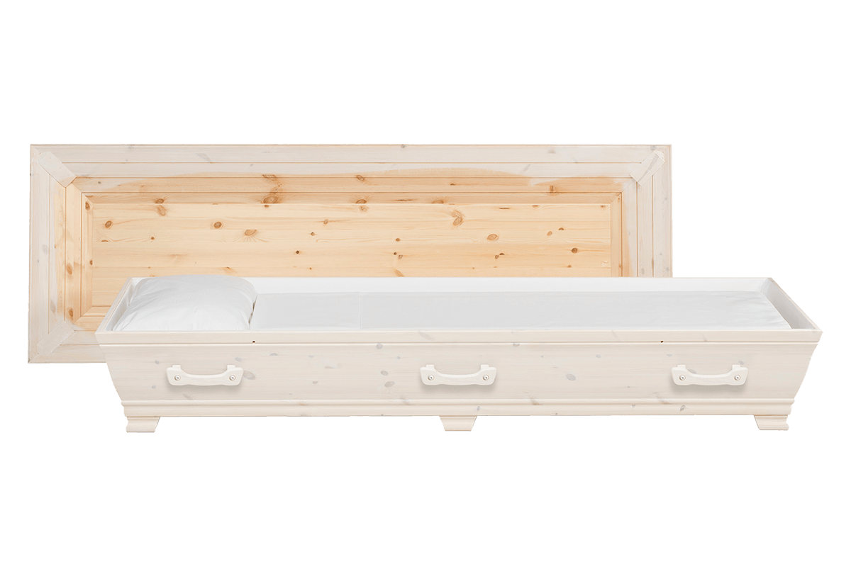 Natur plus är en rymligare och längre kista än våra standardkistor, tillverkad helt och hållet av naturliga och förnyelsebara råvaror. Kistans stomme är gjord av vitlaserad massiv furu, ett träslag känt för sin styrka och tidlösa skönhet. Den obehandlade ytan bevarar träets naturliga struktur och ger en varm och inbjudande känsla. Kistan är limmad med ett miljövänligt vattenbaserat lim, fritt från skadliga ämnen.