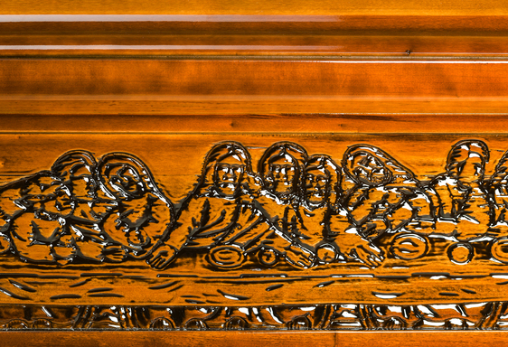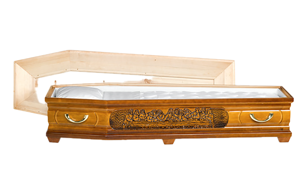 Kista i poppel med ett utfräst motiv av Jesus sista måltid. Denna detaljerade kista är vackert arbetad och prydd med eleganta guldfärgade metallhandtag. Invändigt är kistan klädd med madrass, kudde och ett klassiskt noppat täcke med överlakansflik i bomull. Locket är oklätt och ger kistan ett stilrent intryck. Genom vårt samarbete med Growing Trees Network bidrar vi till klimatkompensation genom att plantera träd.